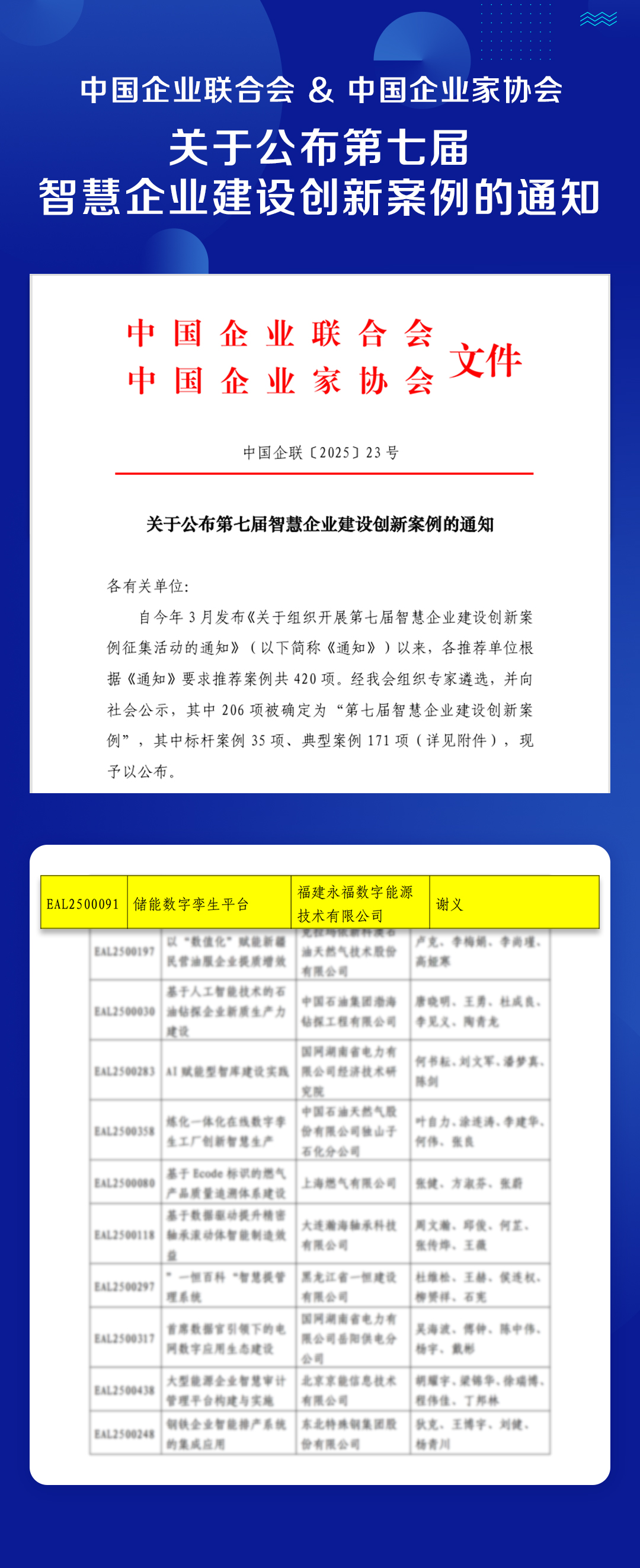 近日,中国企业联合会发布了关于第七届智慧企业建设创新案例的通知,永福数能报送的《储能电站数字孪生平台建设与应用》案例,凭借其在智慧能源领域的创新价值与实践成效,从众多参选项目中脱颖而出,成功入选“解决方案类”创新案例。